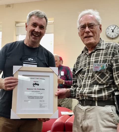 When I travelled or stayed with Ian, I recall (and admired) his meticulous method in preparing breakfasts. These were evident when he always squeezed his own fresh orange juice and blended his magic mix of healthy cereals. He kept his books, woods and microscope in a similar good order. We often discussed the divestment of his wood samples, (how, when, pricing, why and to whom), I agreed to help in this divestment if it was needed. During a visit I was asked to help select books to sell or to donate to IWCS (through our auctions). Most of his wood sample collection have been sold or donated I was relieved to hear. His contributions to the society are many and were recognised with an Honorary Life Membership by his Bendigo Wood Club as well as IWCS.