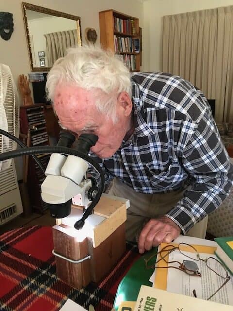 As a keen field collector, Ian always attempted to identify wood correctly. He (like me) didn’t like to arouse attention, so bought and used a quiet electric chainsaw for occasional trimming from fallen trees, especially on the roadside. He (unlike me) was skilled in the art of woodworking, turning, carving and making items of furniture. In Bendigo he was a co-founding member of the Bendigo Woodworkers Club. He was formally trained in forestry and dendrology at Creswick Forestry School in the 40s. It’s now part of Melbourne University. He had connection to and with early wood anatomy pioneers including Eric Dadswell. In more recent years he helped recover and save most of what remained of the famous Dadswell wood collection. With the help of other diligent members in his workshop he recovered what was possible from this vouchered collection. It remains spread across IWCS members as well as into the Creswick wood sample collection. What a fine legacy he leaves with his devotion to wood science by using his skills and dedication. Travelling to South Australia together was a common practice when we would share driving and stop at Coonawarra overnight to visit a daughter where she was a winemaker. We both enjoyed fine wine together with meals. Stopping at Murray Bridge he enjoyed a few hours with a son operating his tyre business there. Long drives were always enjoyable for the conversations we had which covered politics (in IWCS, national and international affairs), family and friends, interesting discoveries in science, in botany and wood, and even astronomy which we both had an interest in. He had a telescope and loved to discuss the mysteries of the universe and deep space. We covered a lot of ground and many subjects over many years including the many mysteries of human nature.