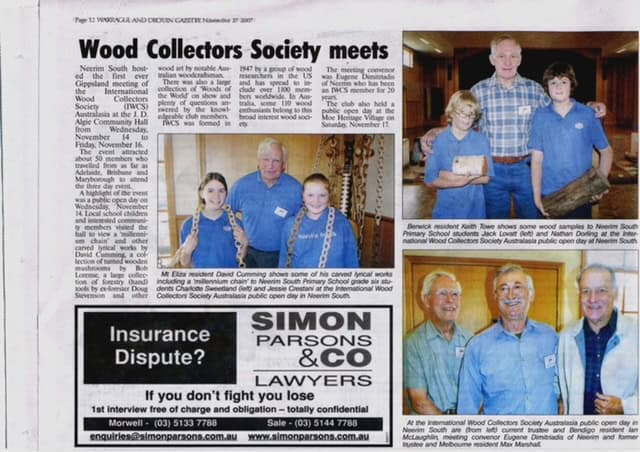 Speaking of divestment: we travelled to Sydney with a trailer to help clear the Bob Goldsack wood and book collection after Bob’s death. It was great to see Gail who helped with the segregation of books. We both enjoyed Bob’s wit and company whenever we were together. On one occasion we three shared a cabin in Belair National Park in SA. The stories, fun and humour were incredible. So much so that I fell over in a fit not being able to catch my breath while laughing! I recall the meeting focus was on wood anatomy and identification with Jim Schubert showing his wood slides and microscopes. Bob’s academic (chemistry) background meant that Bob and I were often discussing scientific matters which Ian contributed to and enjoyed enormously. We returned to Bendigo where the wood samples and slides and many books from Bob’s studies were segregated. We agreed they would be distributed among IWCS members. This subject (the disbursement of our wood collections and those under our care) was a hot subject with Ian, one we often discussed and always agreed on.